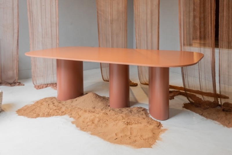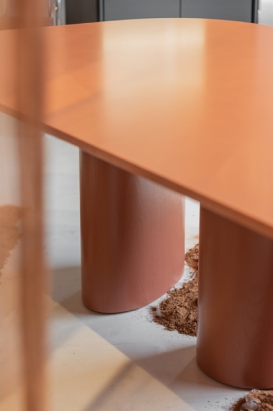 MATERIAL Base tótem de madera enchapada en terracota, tapa de Silestone Arcilla Red.