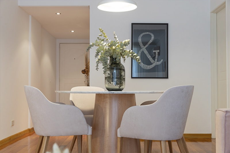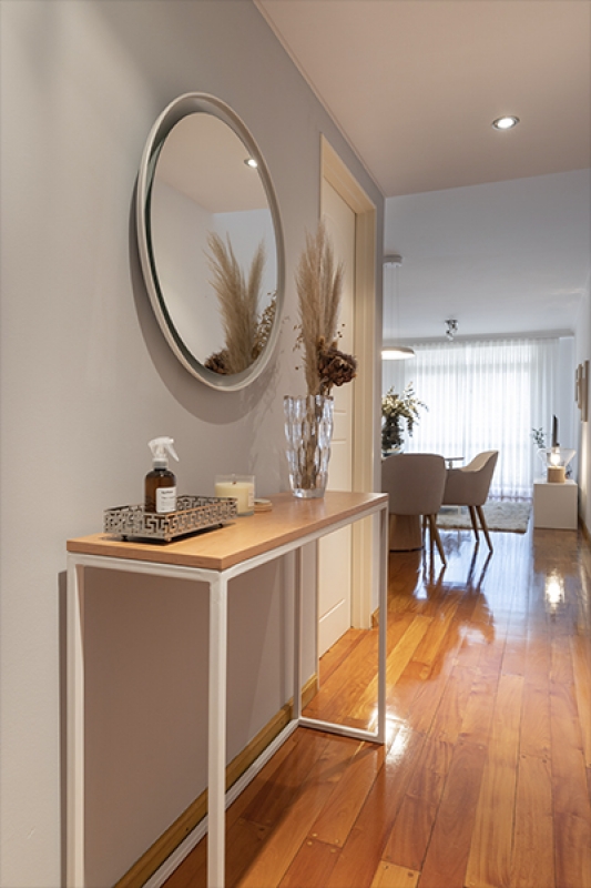 La paleta de colores elegida facilita la conexión visual del ingreso, living y comedor diario. Junto a la cliente elegimos mobiliario y texturas de la línea "Fresh", generando un espacio luminoso, cálido y moderno.
