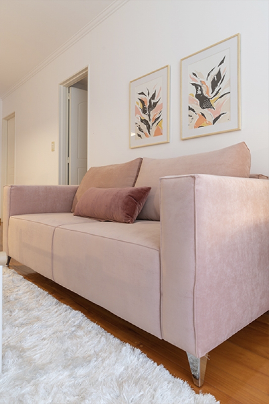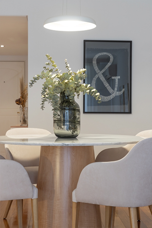 La mesa tótem, en esta ocasión en madera lenga + mármol carrara, el sofá en pana apricót y las sillas "Fresh" junto con detalles personales y obras de arte completan la escena.